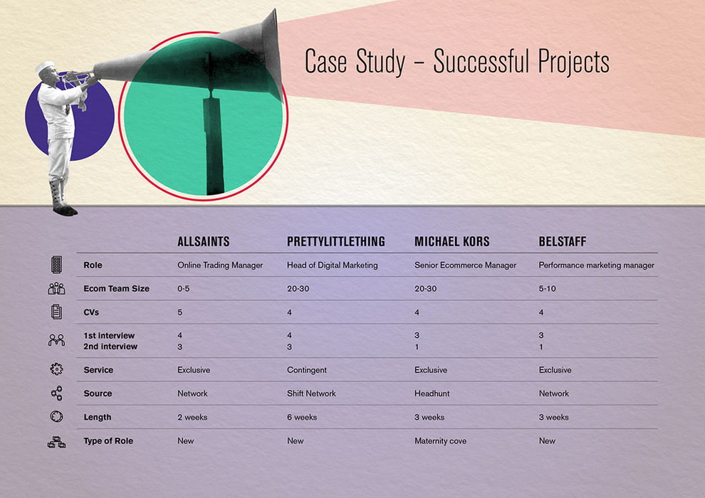 Shift Recruitment, established in 2017, focused on consulting and recruiting services in the e-commerce sector. They positioned themselves as a challenger brand in a competitive marketplace delivering a unique personal service to HR departments in small and large firms. Shift aimed to redefine the industry standard by providing a personal touch for their client and candidate alike.